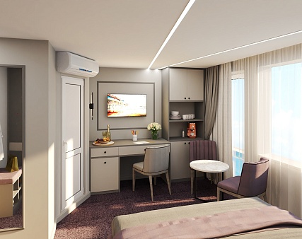 В каюте: двуспальная кровать, диван с 2 спальным местом, прикроватные тумбы, шкаф для одежды, стеллаж или буфет для посуды, стол письменный, пуф, стол журнальный, вешалка напольная для верхней одежды, сейф, зеркало, холодильник, ванная комната (раковина, душевая кабина, туалет), телевизор с приемом спутниковых каналов, внутренний телефон, фен, капсульная кофейная машина (бесплатные капсулы без ограничений), необходимое кол-во розеток 220 V, кондиционер, радио, обзорные окна, балкон с мебелью для отдыха.