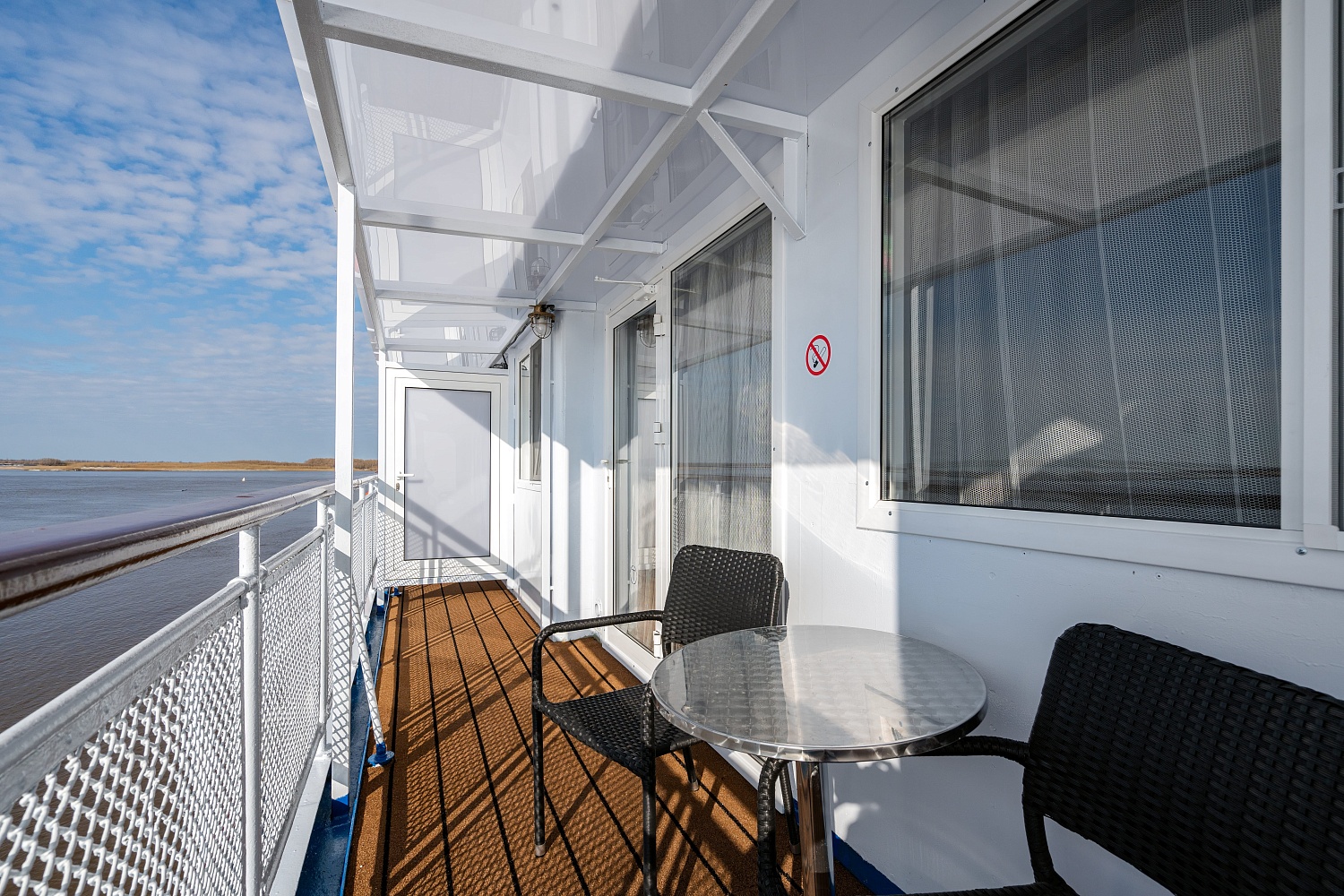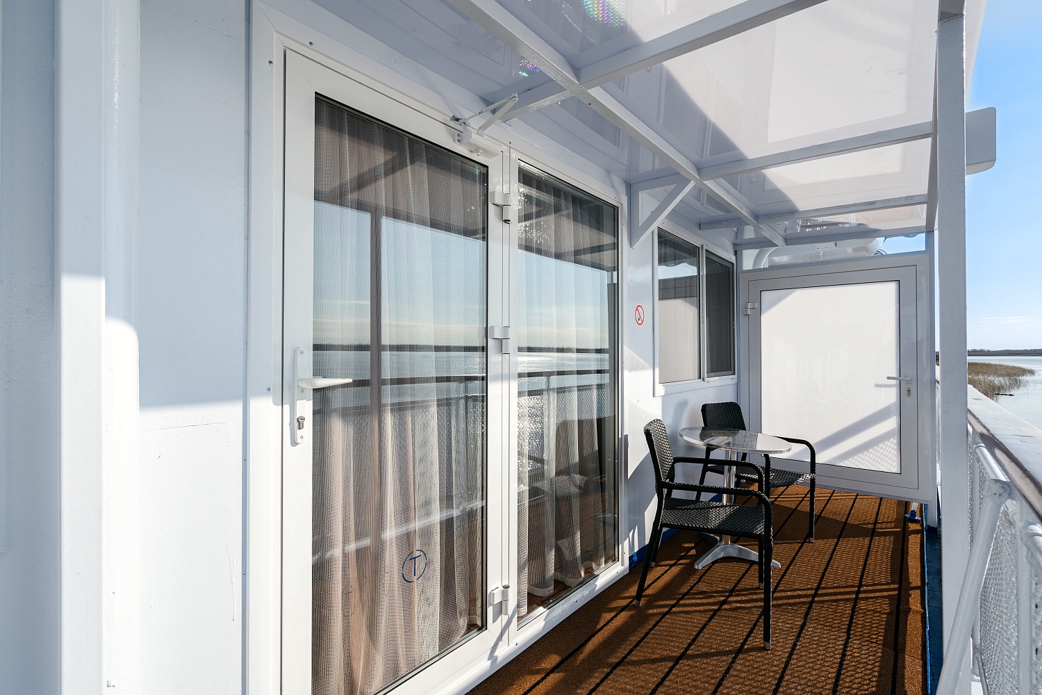 В каюте: одна двуспальная кровать (при необходимости трансформируется в две односпальные кровати), ванная комната (раковина, душ, туалет), две прикроватные тумбы, два кресла, стол письменный, стол журнальный, пуф, шкаф для одежды, вешалка напольная для верхней одежды, стеллаж или буфет для посуды, зеркало, холодильник, кондиционер, радио, сейф, фен, телевизор с кабельным и спутниковым вещанием, розетки 220 V, обзорное окно, балкон с мебелью для отдыха.
