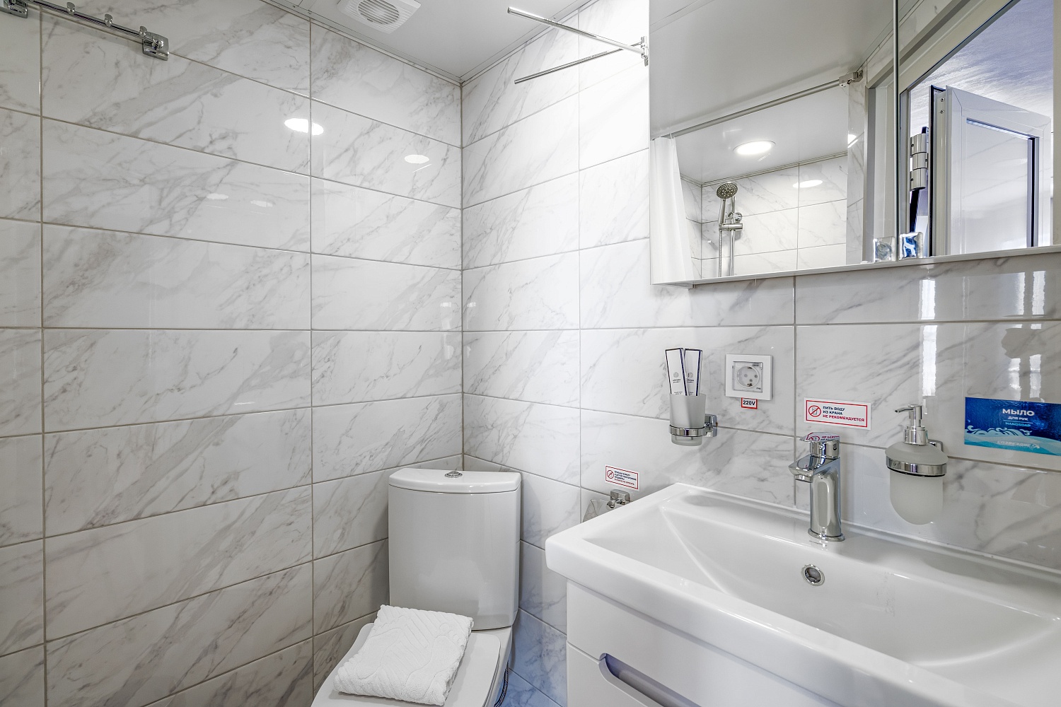 В каюте: две односпальные кровати, ванная комната (раковина, душ, туалет), стол, зеркало, кресло, шкаф для одежды, настенная полка, вешалка для верхней одежды, телевизор с кабельным и спутниковым вещанием, радио, телефон внутренней связи, холодильник, кондиционер, фен, розетки 220 V, обзорное окно.