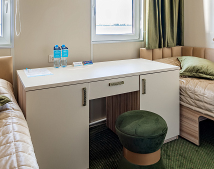 В каюте: одна двуспальная кровать (при необходимости трансформируется в две односпальные кровати), 2 прикроватные тумбы, стол письменный, стул, банкетка, шкаф, вешалка для верхней одежды, зеркало, холодильник, ванная комната (раковина, душ, туалет), кондиционер, радио, сейф, фен, плед для каждого туриста, телевизор с кабельным и спутниковым вещанием, розетки 220 V, обзорное окно.