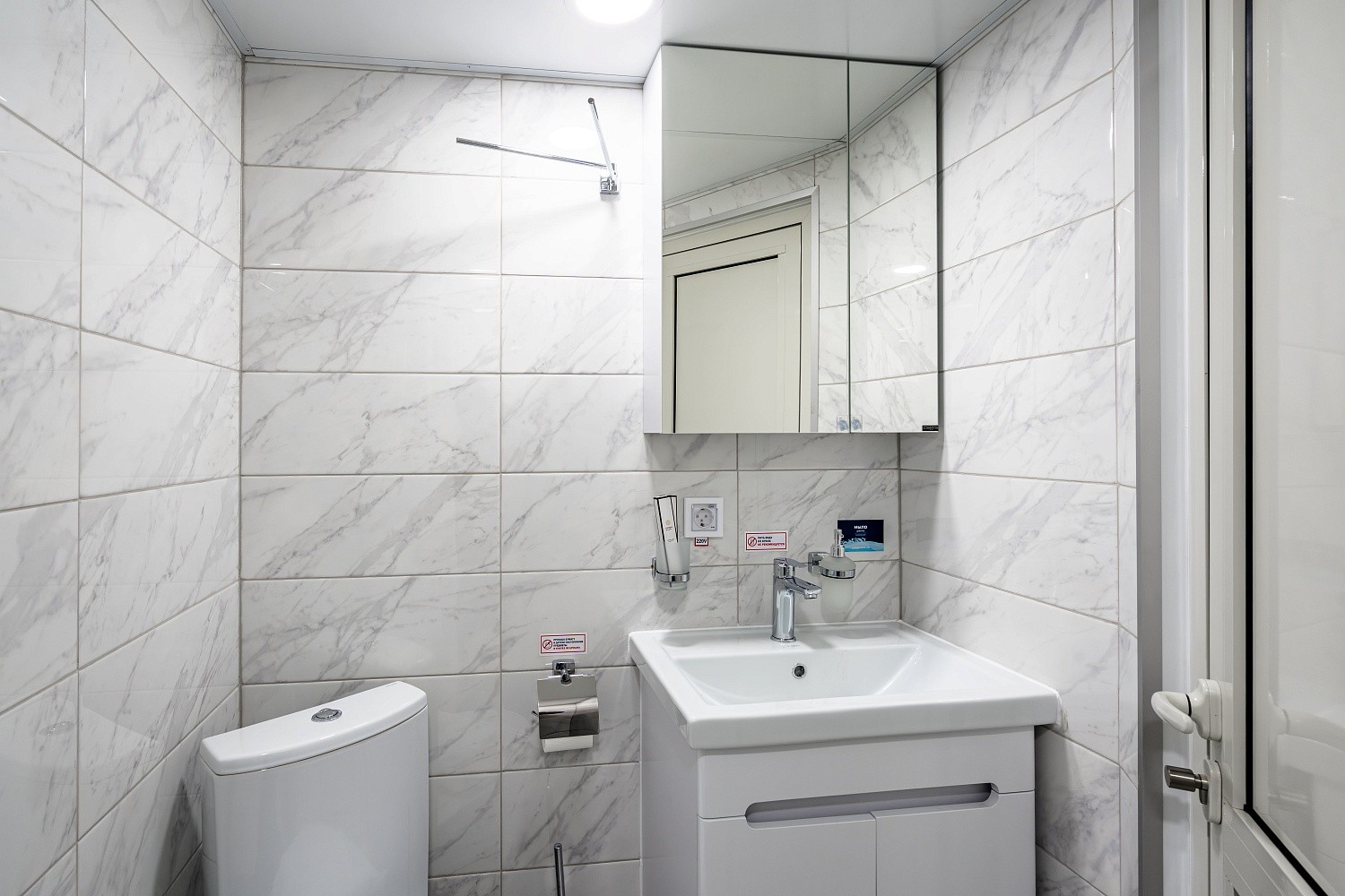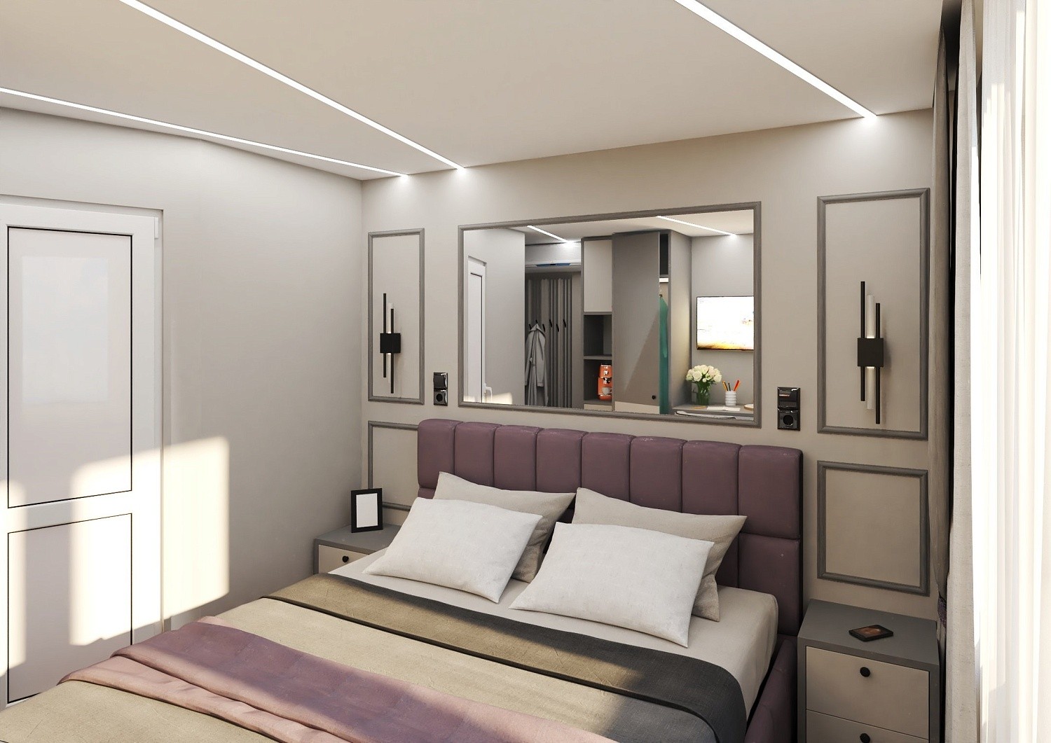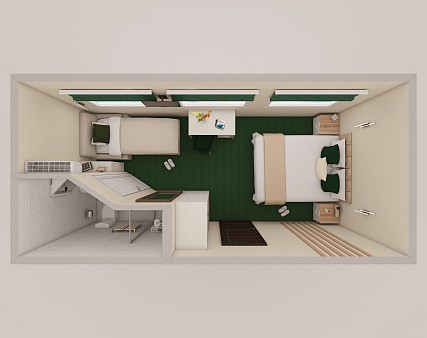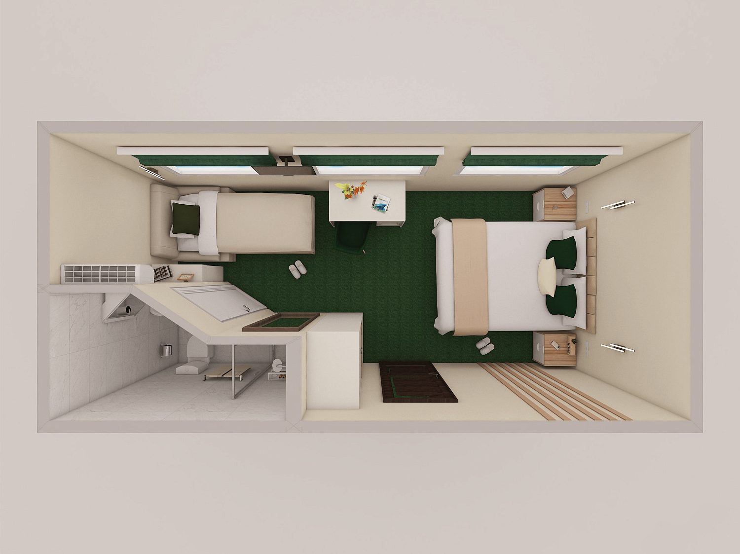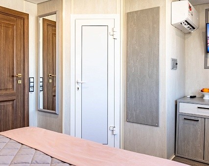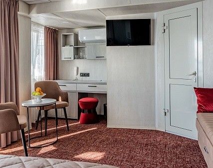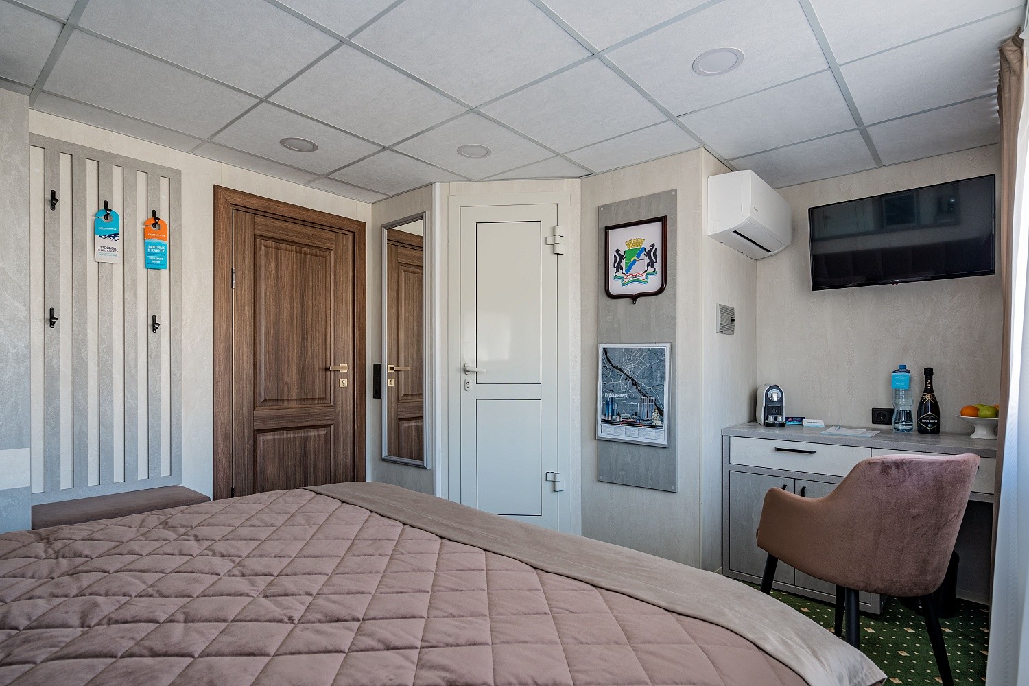 В каюте: одна двуспальная кровать (при необходимости трансформируется в две односпальные кровати), 2 прикроватные тумбы, стол письменный, стул, банкетка, шкаф, вешалка для верхней одежды, зеркало, холодильник, ванная комната (раковина, душ, туалет), кондиционер, радио, сейф, фен, плед для каждого туриста, телевизор с кабельным и спутниковым вещанием, розетки 220 V, обзорное окно.