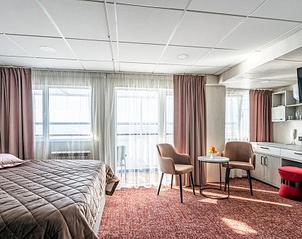 В каюте: двуспальная кровать, диван с 2 спальным местом, прикроватные тумбы, шкаф для одежды, стеллаж или буфет для посуды, стол письменный, пуф, стол журнальный, вешалка напольная для верхней одежды, сейф, зеркало, холодильник, ванная комната (раковина, душевая кабина, туалет), телевизор с приемом спутниковых каналов, внутренний телефон, фен, капсульная кофейная машина (бесплатные капсулы без ограничений), необходимое кол-во розеток 220 V, кондиционер, радио, обзорные окна, балкон с мебелью для отдыха.