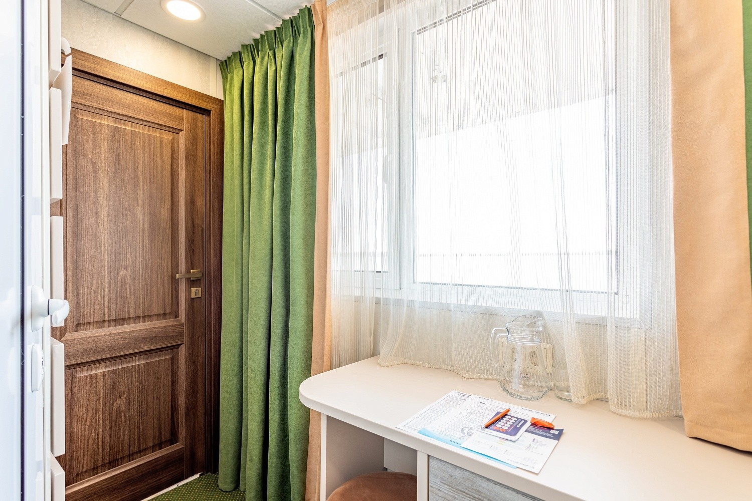 В каюте: односпальная кровать, ванная комната (раковина, душ, туалет), шкаф, тумба, стул, стол, телевизор с приемом спутниковых каналов, холодильник, фен, плед для каждого туриста, розетка 220 V, щетка для одежды, обзорное окно.