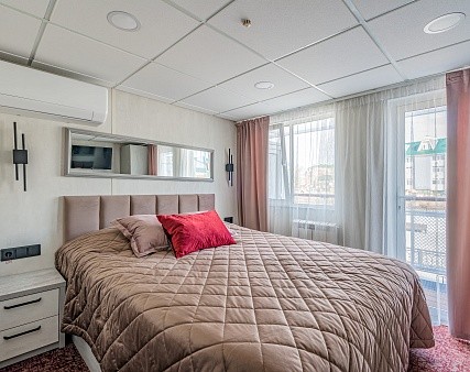 В каюте: одна двуспальная кровать (при необходимости трансформируется в две односпальные кровати), 2 прикроватные тумбы, стол письменный, пуф/стул, шкаф для одежды и посуды, вешалка для верхней одежды, зеркало, холодильник, ванная комната (раковина, душ, туалет), кондиционер, радио, сейф, фен, телевизор с кабельным и спутниковым вещанием, розетки 220 V, обзорное окно, балкон с мебелью для отдыха.