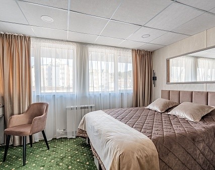 В каюте: одна двуспальная кровать (при необходимости трансформируется в две односпальные кровати), ванная комната (раковина, душевая кабина, туалет), прикроватные тумбы, кресло, стол, шкаф для одежды, вешалка для верхней одежды, зеркало, телевизор с кабельным и спутниковым вещанием, радио, телефон внутренней связи, холодильник, кондиционер, сейф, фен, розетки 220 V, два обзорных окна.