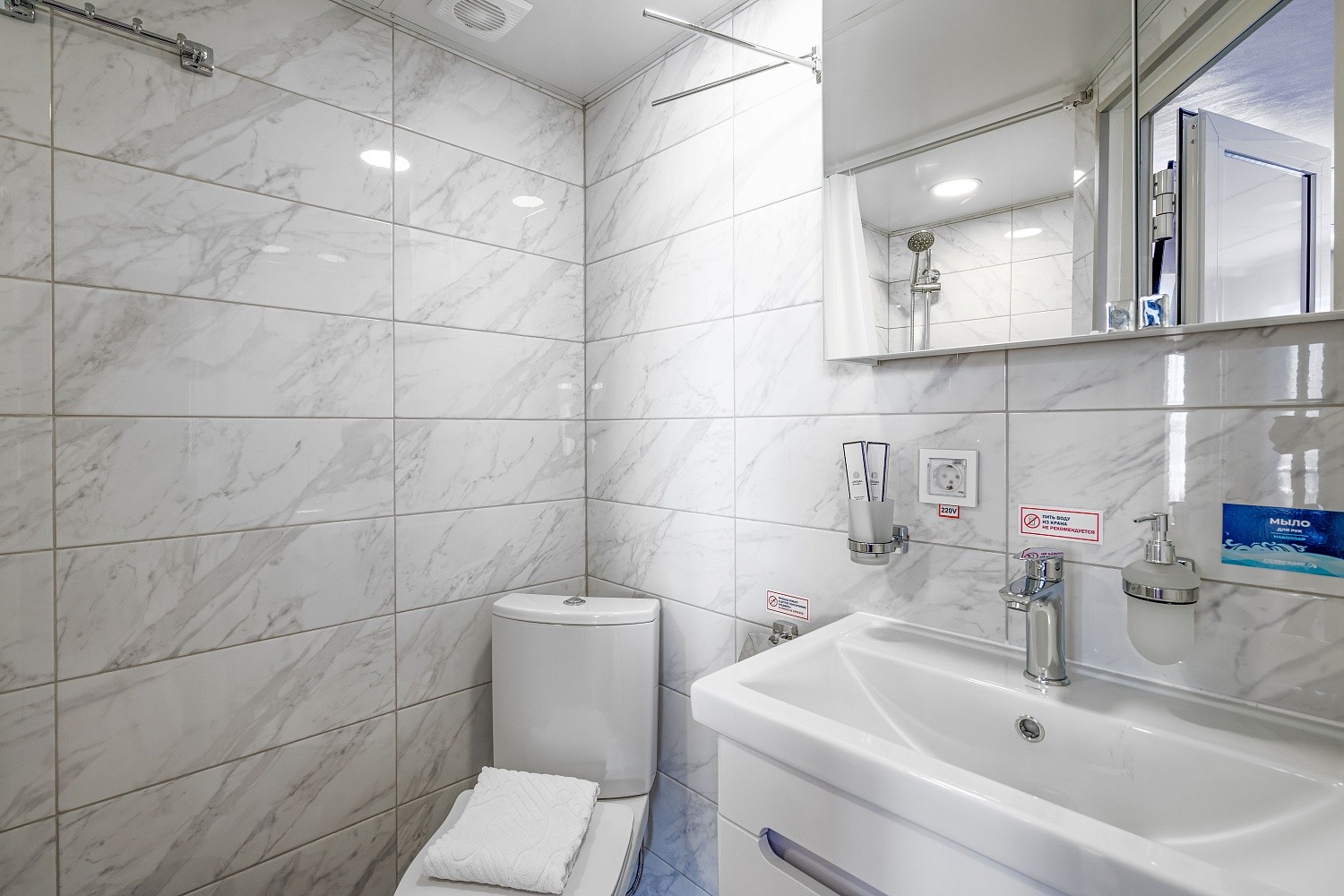 В каюте: две односпальные кровати, тумбочка, шкаф для одежды, стол, мягкий пуф, вешалка для верхней одежды, зеркало, радио, телевизор с кабельным и спутниковым вещанием, телефон, холодильник, ванная комната (раковина, душ, туалет), фен, пледы, щетка для одежды, розетки 220 V, кондиционер, обзорное окно.