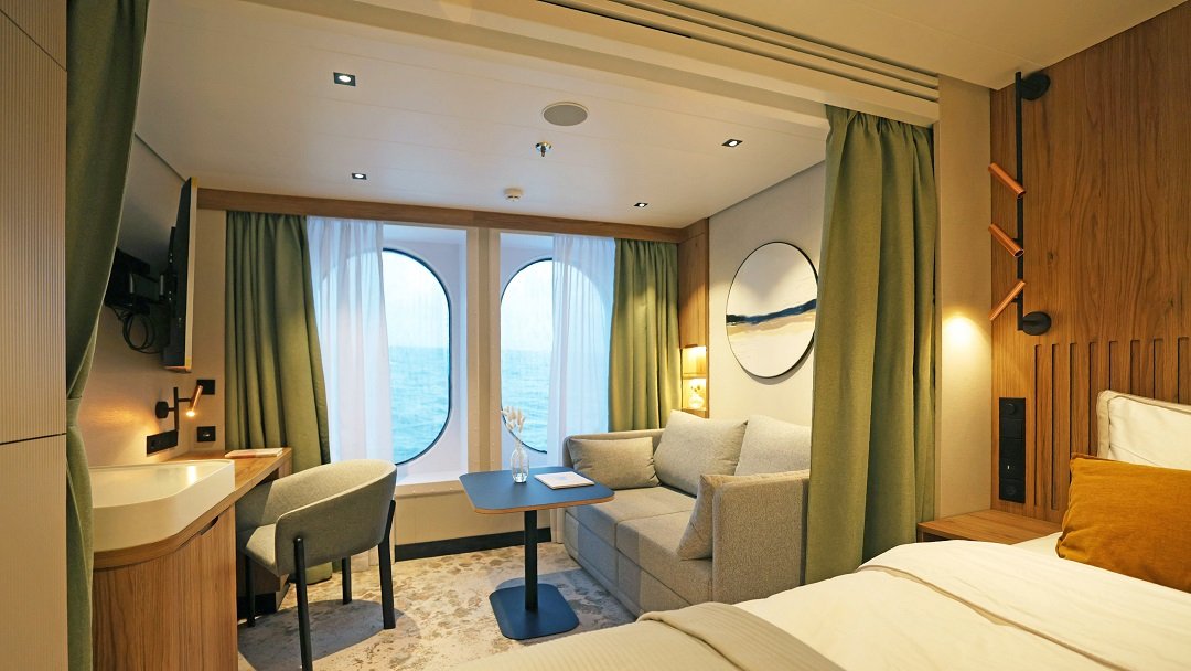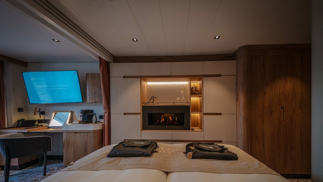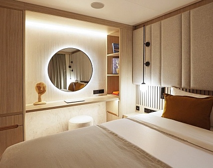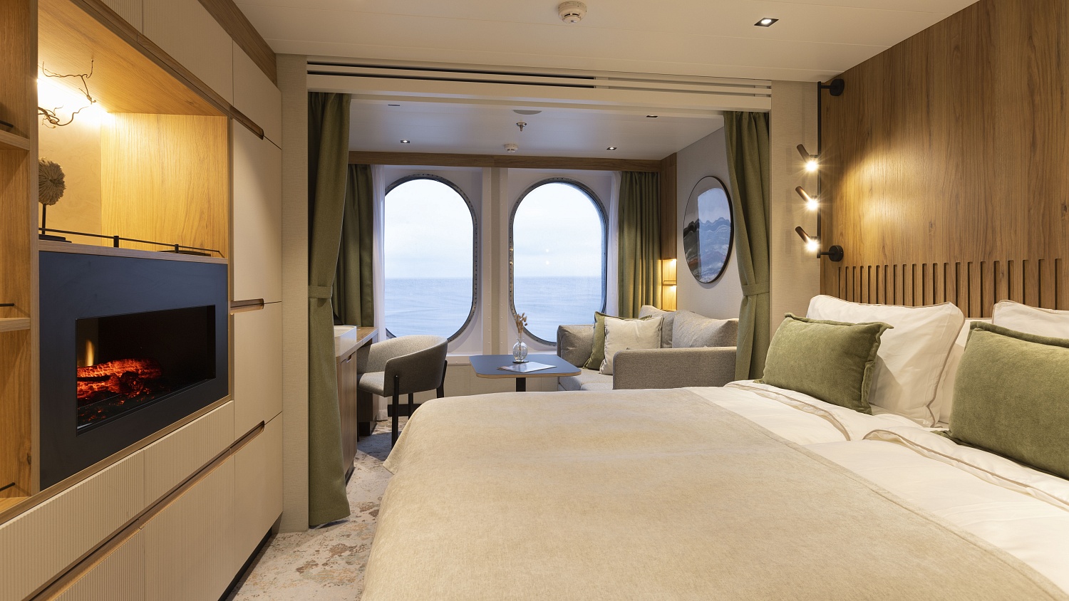 Интерьер каюты с видом на океан выполнен в светлых тонах с использованием натуральных материалов, создавая атмосферу уюта и комфорта. Зона спальни оснащена двуспальной кроватью, конвертируемой в две односпальные (по запросу) и оборудована голографическим камином с эффектом живого пламени.