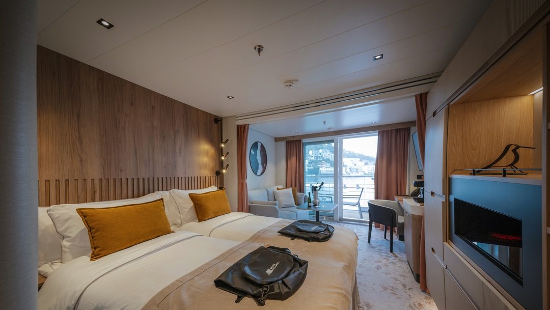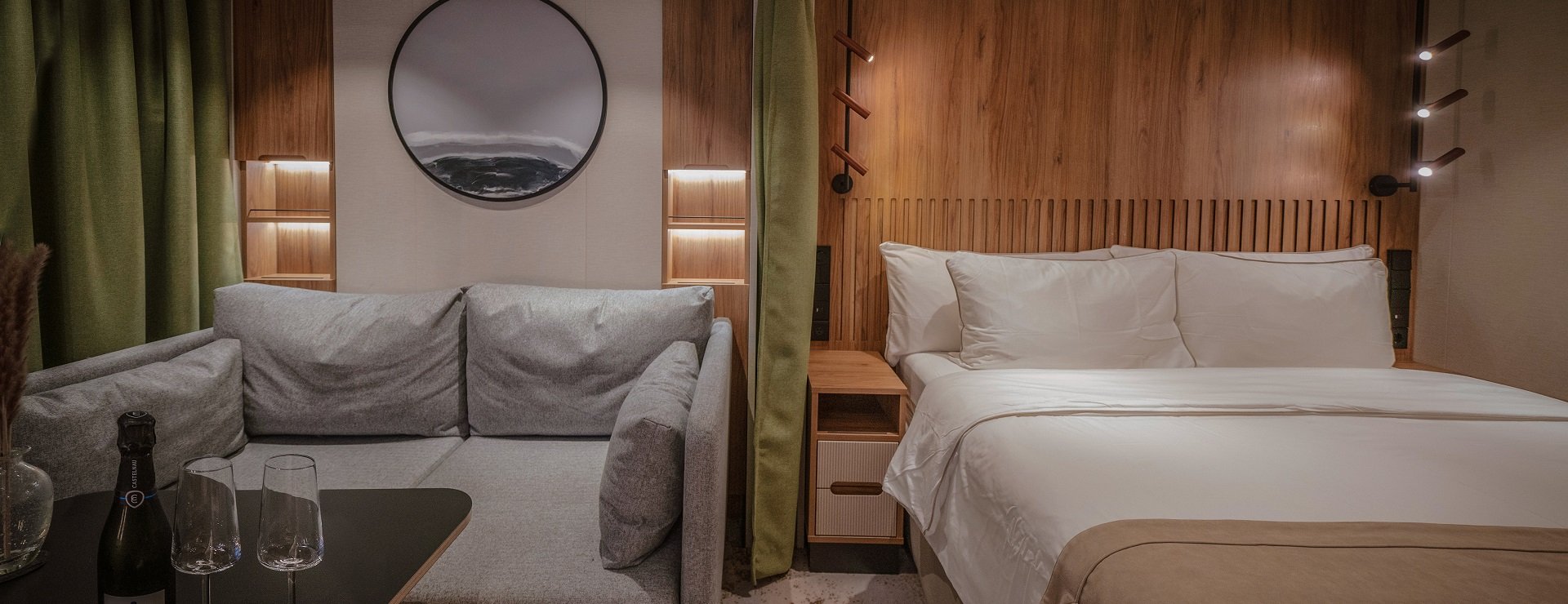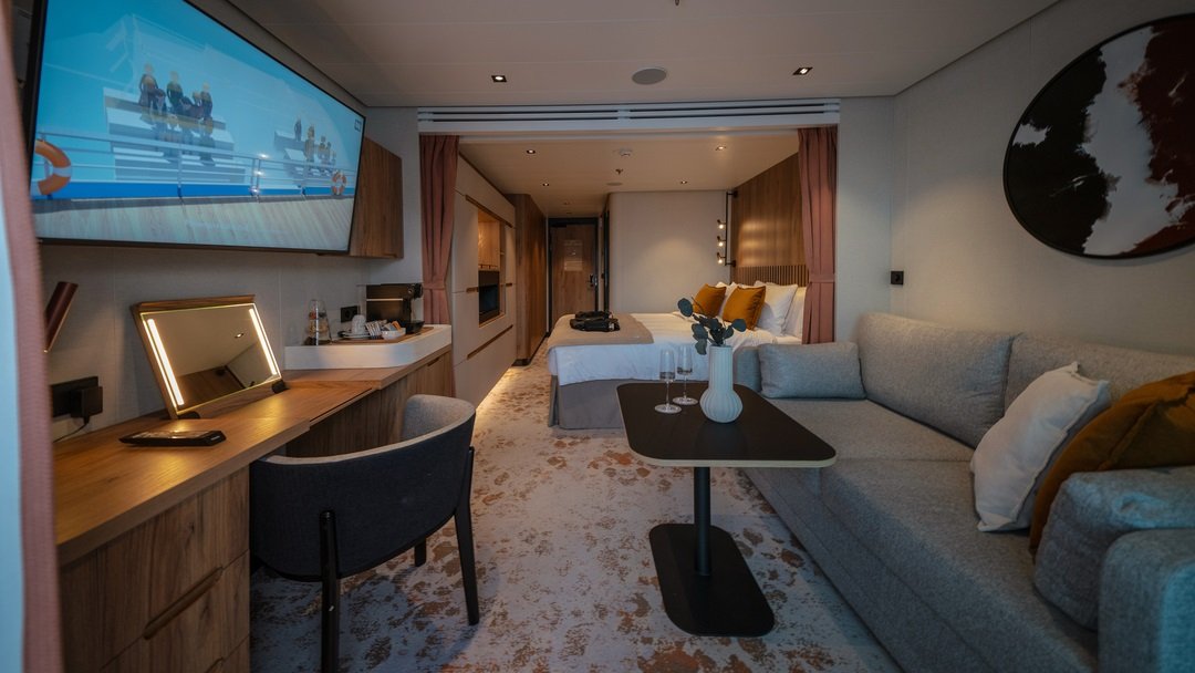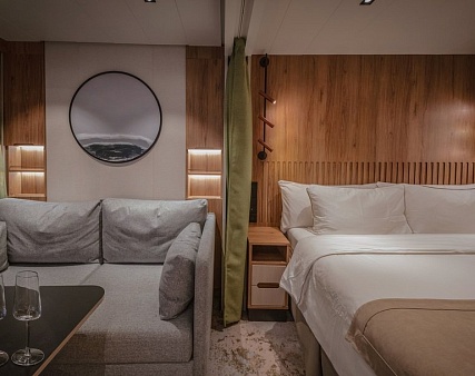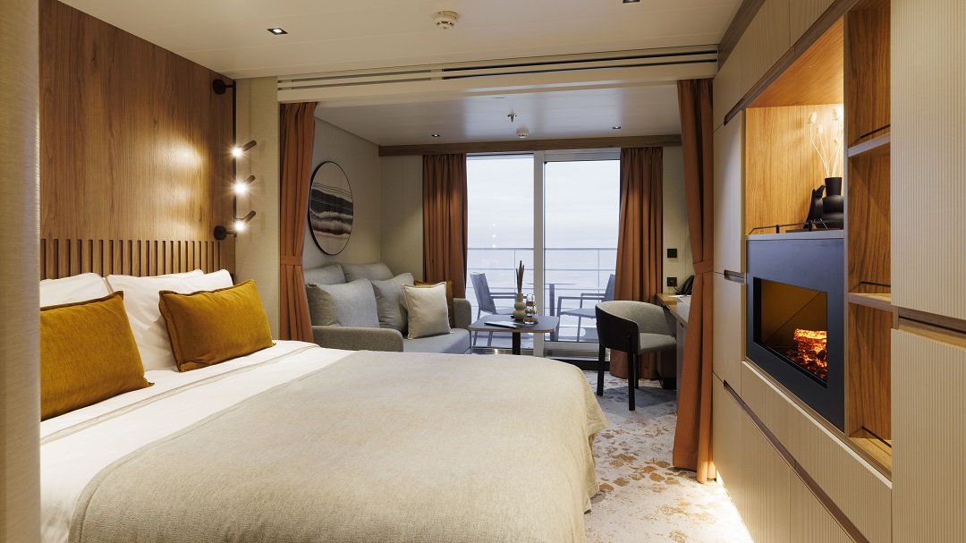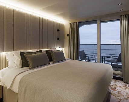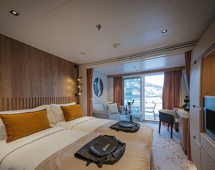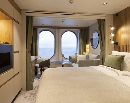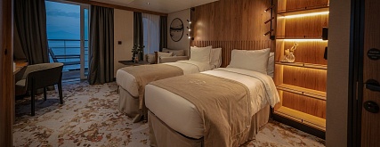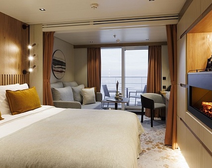 Благодаря наличию панорамного балкона 5 кв.м. каюта всегда наполнена светом. Зона спальни оснащена двуспальной кроватью, конвертируемой в две односпальные по запросу, и оборудована голографическим камином с эффектом живого пламени. Уютная зона гостиной располагает диваном и кофейным столиком. Завтрак на собственном балконе, отдых в зоне гостиной после насыщенного дня или послеобеденный сон – комфортное зонирование каюты позволяет гостям следовать собственным биологическим часам и не зависеть от планов своего спутника. Элегантная ванная комната оснащена душевой кабиной.