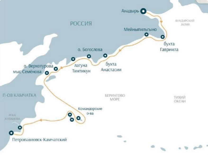 Петропавловск-КамчатскийРека ЖупановаКомандорские острова (3 дня)Остров ВерхотуроваБухта Южная Глубокая, Лагуна Тинтикун, Бухта ЛавроваОстров Богослова, Бухта Петра и Бухта ПавлаМейныпи́льгыноБухта ГавриилаАнадырь