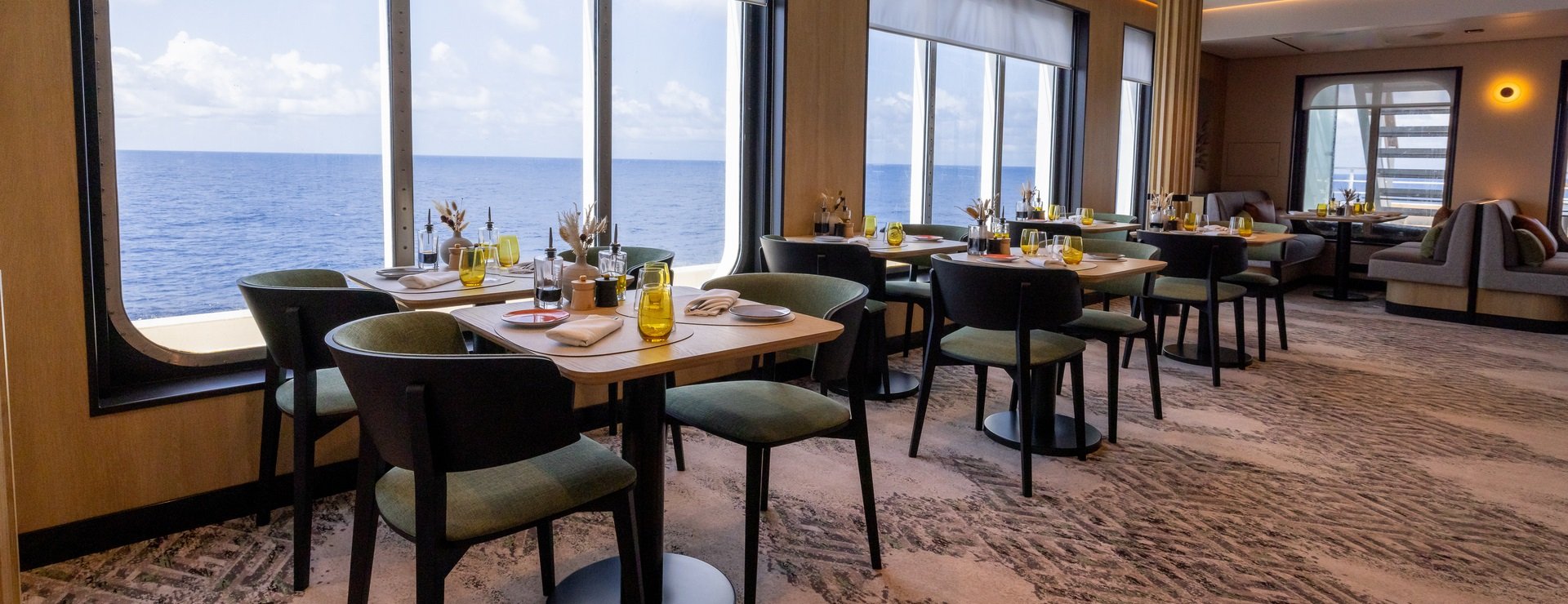 Интерьер каюты с видом на океан выполнен в светлых тонах с использованием натуральных материалов, создавая атмосферу уюта и комфорта. Зона спальни оснащена двуспальной кроватью, конвертируемой в две односпальные (по запросу) и оборудована голографическим камином с эффектом живого пламени.