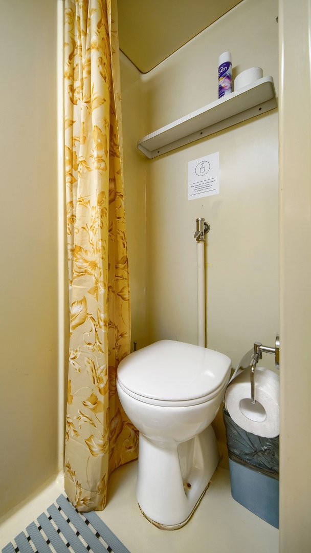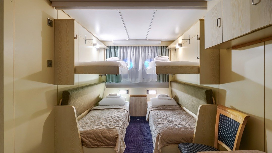В каюте: четыре спальных места (два внизу, два вторым ярусом), шкаф для одежды, радио, душ, санузел, кондиционер, два иллюминатора, электророзетка на 220V. Площадь каюты - 12,81 кв.м.