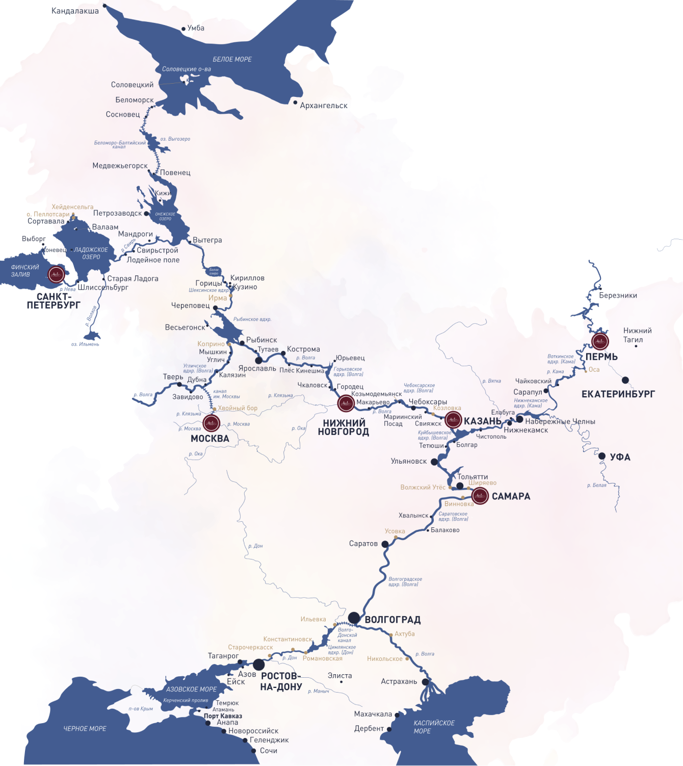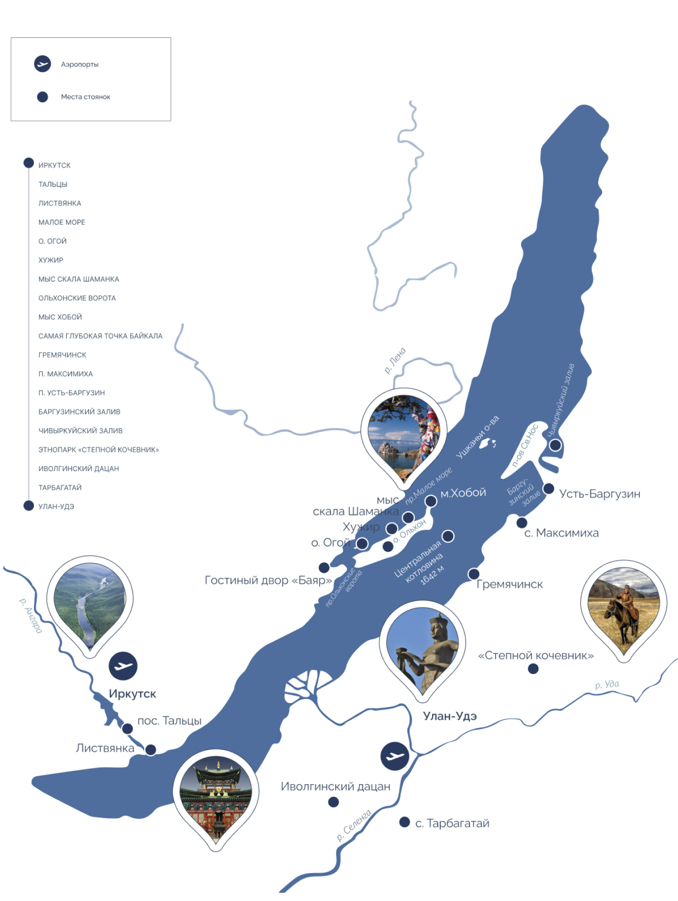 ИркутскУлан-УдэМосква (Северный Речной Вокзал)Санкт-ПетербургНижний НовгородСамараВолгоградКазаньАстраханьКрасноярскСаратовНижнекамскПермьЯрославльКостромаАнапаАрхангельскБарабановоБаргузинский заливБахтаБеломорскБерезникиБолгарБухта ПесчанаяВалаамВороговоВыборгВытеграГаланиноГеленджикГорицыГородецГремячинскДербентДубнаДудинкаЕйскЕкатеринбургЕлабугаЕнисейскЕрмаковоИволгинский дацанИгаркаИльевкаИрмаИсток АнгарыКазачинский порогКалязинКанготовоКандалакшаКижиКинешмаКозьмодемьянскКоневецКоприноКругобайкальская железная дорога (КБЖД)КузиноЛиствянкаЛодейное ПолеМакарьевоМалое мореМандрогиМариинский ПосадМахачкалаМыс Скала ШаманкаМыс ХобойМыс Цаган-ХушунМышкинНижний ТагилНикольскоеНовороссийскНорильско. Огойо. ОльхонОльхонские воротаострова Малого моряп. Максимиха (Бурятия)п. Усть-Баргузин (Бурятия)ПетрозаводскПлато ПуторанаПлёсПовенецПолярный круг. ЕнисейПорт КавказРомановскаяРостов-на-ДонуРыбинскСамая глубокая точка БайкалаСарапулСвирьстройСвияжскСоловецкие островаСосновецСтарая ЛадогаСтепной КочевникТаганрогТальцыТанхойТарбагатайТверьТетюшиТольяттиТуруханскТутаевТыяхаУгличУлан-УдэУльяновскУсовкаУфаУшканьи островаХийденсельгаХужирЧайковскийЧебоксарыЧереповецЧивыркуйский заливЧистопольЧкаловскШлиссельбург (Крепость Орешек)ЮрьевецЯрцево