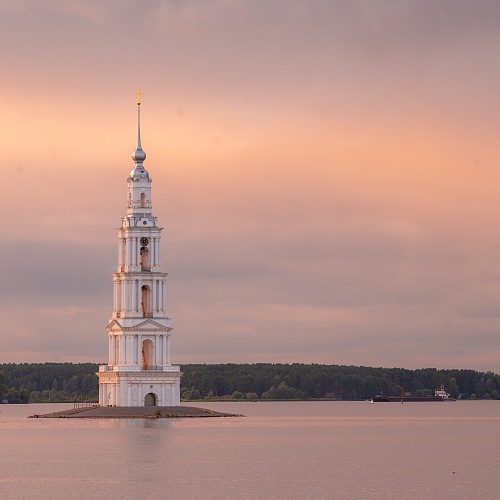 Разрушен был и стоящий на правом берегу собор Николы-на-Жабне (монастырь был упразднен еще в XVII в). Именно в этом месте находилось первое поселение, давшее начало Калязину — Никола-на-Жабне. Оно возникло еще в XI — XII вв. Осталась одна колокольня Николаевского собора, построенная в 1800 г. крепостными крестьянами В.Ушакова, владельца соседнего села Никитское, деда Е.Ушаковой, в которую был влюблен А.Пушкин. На колокольне висело 11 колоколов, самый большой из которых весил 8 т. До образования Угличского водохранилища колокольня, как и собор, стояла на Центральной торговой площади города. Рядом находился еще один храм — зимняя церковь Иоанна Предтечи (1792 г.). Потом практически вся правобережная часть города скрылась под водой. Сегодня Николаевскую колокольню, поднимающуюся ввысь на 70 м, можно назвать грустным и величественным памятником былой мощи Калязина. Ее тоже хотели уничтожить, но два взрыва оказались бессильны. Впоследствии колокольне нашли применение парашютисты — она служила местом их тренировок. Несколько десятилетий путешественники на теплоходе видели Николаевскую колокольню высящейся непосредственно из воды. К концу 1980-х гг. было принято решение укрепить «символ Калязина» — насыпать небольшой островок. Кроме этого, на колокольне провели небольшие реставрационные работы, на ее вершине установили крест. 22 мая 2007 г. в ней была совершена Божественная литургия. А в период навигации к островку курсирует прогулочный теплоход с желающими постоять у стен знаменитого калязинского памятника.