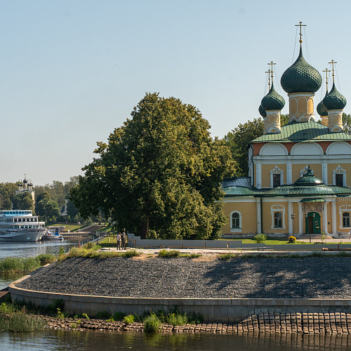 С борта теплохода открывается изумительная панорама Угличского кремля: знаменитая церковь Дмитрия «на Крови», величественный пятиглавый Спасо-Преображенский собор с колокольней.