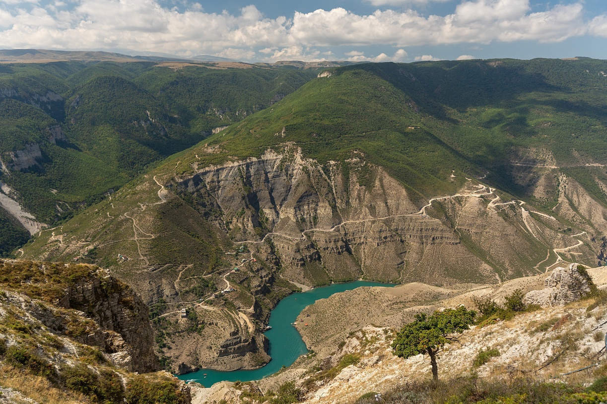 08:00–11:00 Сулакский каньон. Мы отправляемся к одному из самых глубоких каньонов в мире. По пути сделаем остановку у живописного Чиркейского водохранилища, а затем прибудем на смотровую площадку, откуда открываются виды на бирюзовую реку среди отвесных скал.