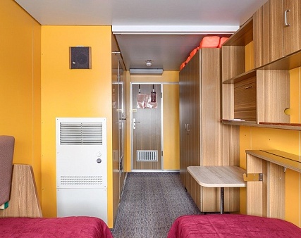 В каюте: четыре спальных места (два внизу, два вторым ярусом), шкаф для одежды, радио, душ, санузел, кондиционер, два иллюминатора, электророзетка на 220V. Площадь каюты - 12,81 кв.м.