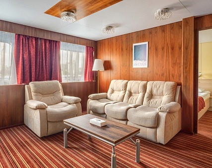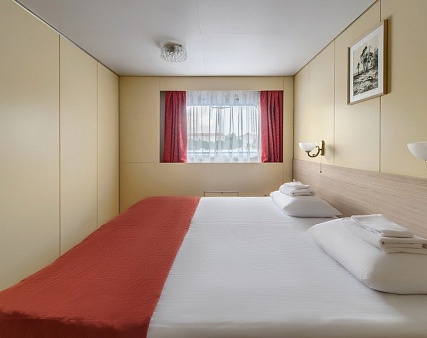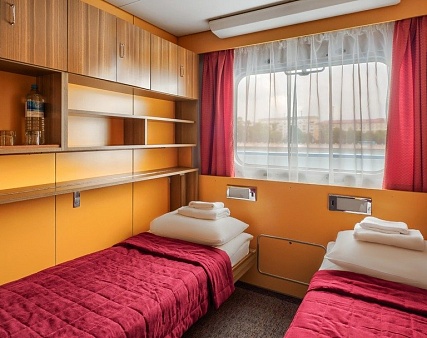 В каюте: два спальных места, шкаф для одежды, радио, душ, санузел, кондиционер, обзорное окно, электророзетка на 220V.