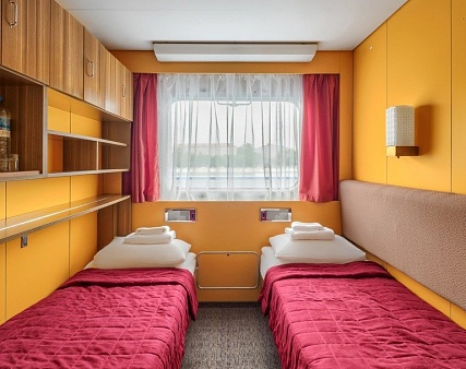 В каюте: два спальных места, шкаф для одежды, радио, душ, санузел, кондиционер, обзорное окно, электророзетка на 220V.
