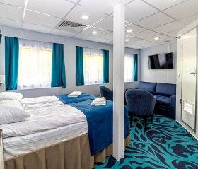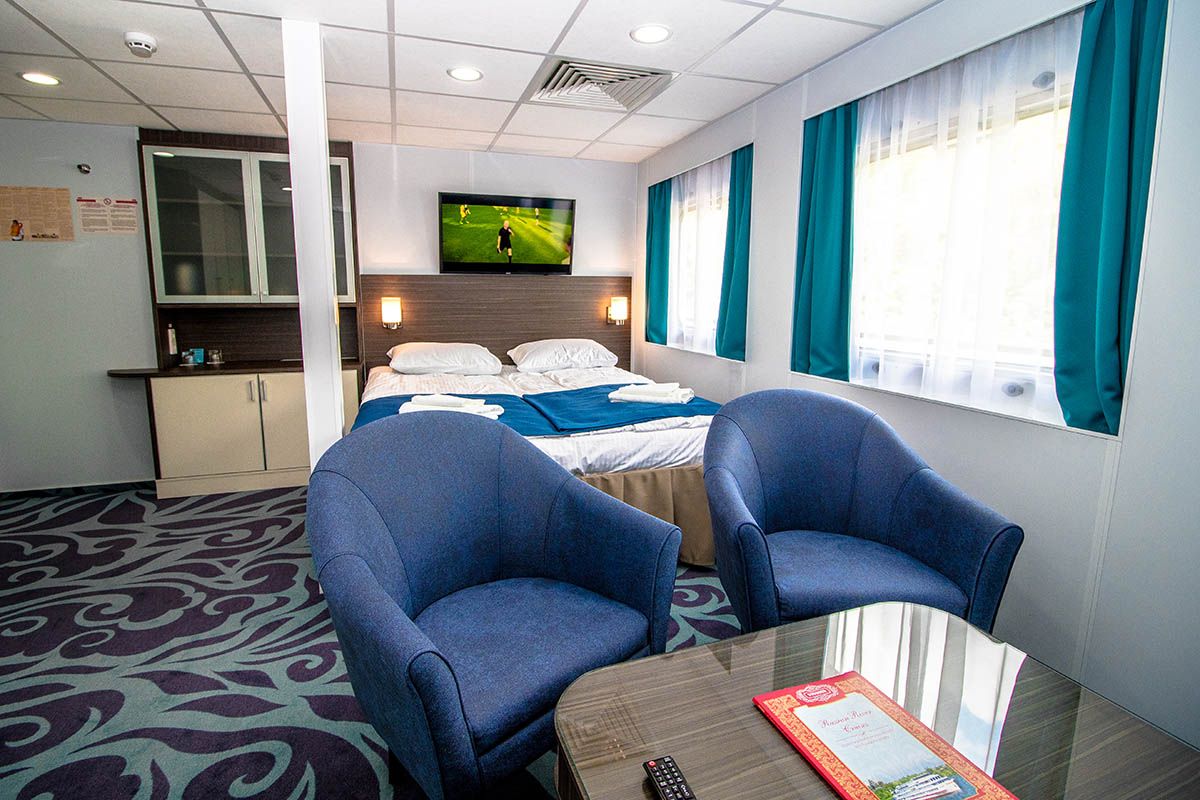 В каюте: двуспальная кровать, прикроватные тумбы, диван (140х150 см) и кресло, журнальный столик, шкаф, телевизор, холодильник, радио, фен, сейф, три обзорных окна, электророзетка на 220V.