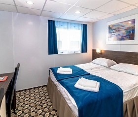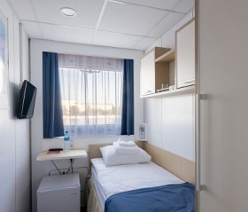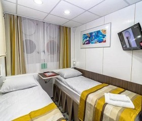 В каюте: три спальных места (два внизу, одно — вторым ярусом), шкаф для одежды, трюмо, радио, телевизор, фен, холодильник, сейф, два иллюминатора, электророзетка на 220V.