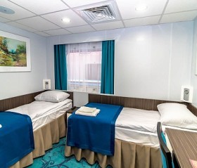 В каюте: кровать, шкаф для одежды, трюмо, телевизор, холодильник, сейф, радио, фен, одно обзорное окно, электророзетка на 220V. Две односпальные кровати размером 80х190 см, площадь каюты 13,2 м2.
