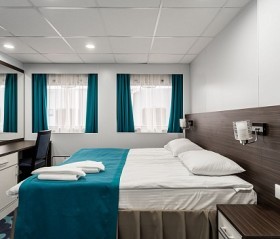 В каюте: кровать, шкаф для одежды, трюмо, телевизор, холодильник, сейф, радио, фен, одно обзорное окно, электророзетка на 220V. Двуспальная кровать размером 160х200 см, площадь каюты 15,5 м2