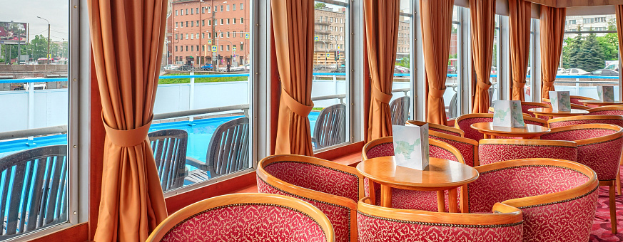 - Ужин — заказная система питания (выбор блюд со 2-го дня круиза). Включённые напитки (без ограничения): вода, чай, кофе, кисломолочный напиток (1 стакан 200 мл на ужин по запросу гостя). На выбор: вино красное / белое / игристое (1 бокал, 125 мл) / водка (1 рюмка, 50 мл) / пиво (1 бокал, 300 мл), домашний морс (1 бокал, 200 мл);