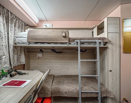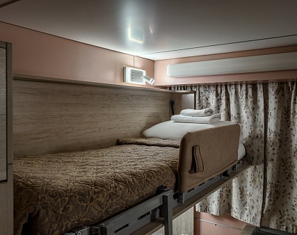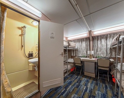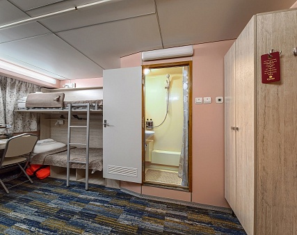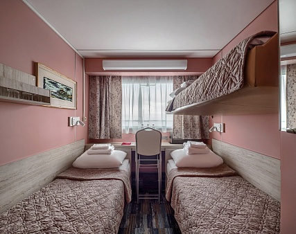 В каюте: четыре спальных места (два внизу, два вторым ярусом), шкаф для одежды, радио, душ, 2 санузла, холодильник, кондиционер, два обзорных окна, электророзетка 220V, фен.