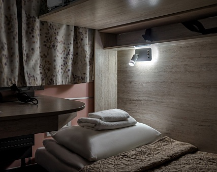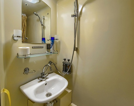 В каюте: два спальных места (одно над другим), шкаф для одежды, радио, душ, санузел, кондиционер, обзорное окно, электророзетка 220V, фен.