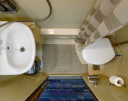 В каюте: три спальных места (два внизу, третье вторым ярусом), шкаф для одежды, радио, душ, санузел, кондиционер, обзорное окно, электророзетка 220V, фен.