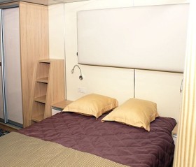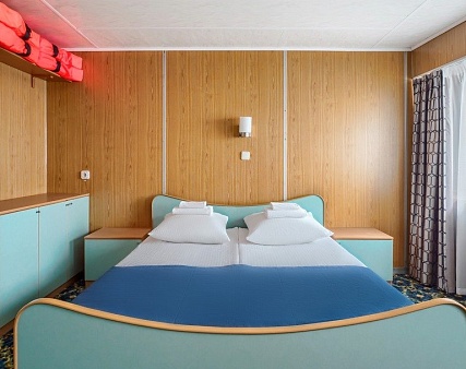 В каюте: двуспальная кровать, одно спальное место вторым ярусом, два шкафа для одежды, зеркало, телевизор, холодильник, радио, фен, два обзорных окна, электророзетка на 220V.