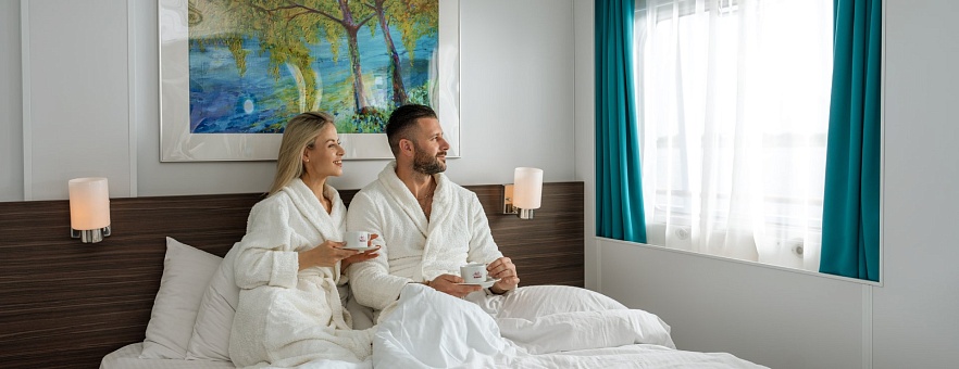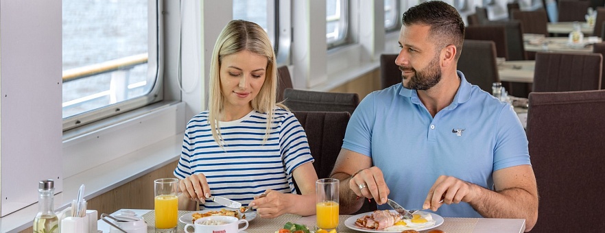 - Полупансион (завтрак + ужин): завтрак — шведский стол или заказная система с элементами шведского стола, фиксированная рассадка. Включённые напитки (без ограничения): вода*, сок, чай, кофе; ужин — заказная система питания (выбор блюд со 2-го дня круиза), фиксированная рассадка. Включённые напитки (без ограничения): вода*, чай, кофе, кисломолочный продукт (1 стакан, 200 мл); порционно на выбор - вино красное / белое / игристое (1 бокал, 125 мл) / водка (1 рюмка, 50 мл) / пиво (1 бокал, 300 мл) / домашний морс (1 бокал, 200 мл).