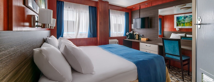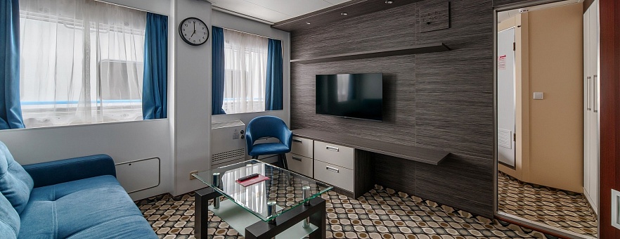 В каюте: три спальных места (два внизу, одно — вторым ярусом), шкаф для одежды, трюмо, кондиционер, радио, телевизор, холодильник, фен, сейф, обзорное окно, электророзетка на 220V.