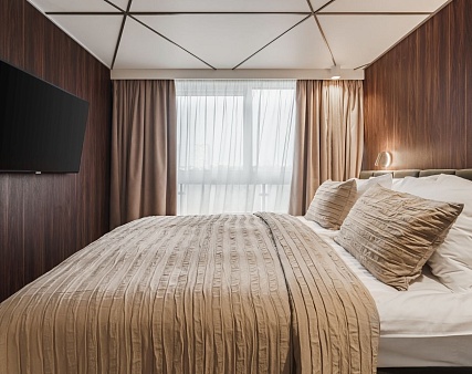 В каюте: двуспальная кровать (раздвигается), панорамные окна, спутниковое ТВ, шкаф для одежды, холодильник, кондиционер, розетки 220V, телефон, радио, фен, капсульная кофемашина, электрочайник, сейф, душ, санузел. Площадь — 24 м2. (площадь балкона Люкса №258 — 6 м2, Люкса №259 — 4 м2.)