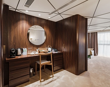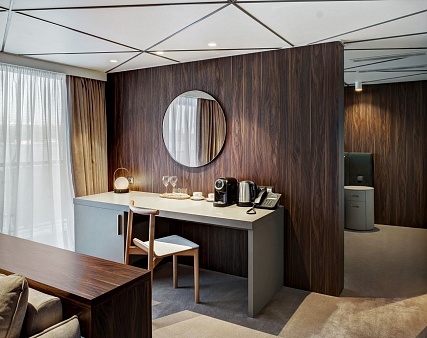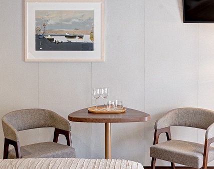 Все каюты теплохода оснащены панорамными окнами, которые словно стирают границу между вами и окружающей природой, позволяют любоваться видами, не выходя из номера. В каждой из них вас ждут дизайнерские интерьеры и комфорт класса люкс: спутниковое ТВ, огромное зеркало, холодильник, сейф, гардероб с набором вешалок, место для чемоданов, банные халаты, ложечка для обуви и зонтики на случай непогоды. В каюте вы найдете холодильник, кофемашину, электрочайник, чашки, бокалы и штопор. Возле окна предусмотрено место для отдыха с креслами и столиком. Закажите завтрак в номер или просто выпейте чая наедине с великолепными пейзажами за бортом.