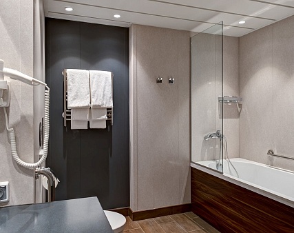 В каюте: две односпальные кровати (сдвигаются), панорамное окно, спутниковое ТВ, шкаф для одежды, холодильник, кондиционер, розетки 220V, телефон, радио, фен, капсульная кофемашина, электрочайник, сейф, душ, санузел. Площадь — 29 м2.