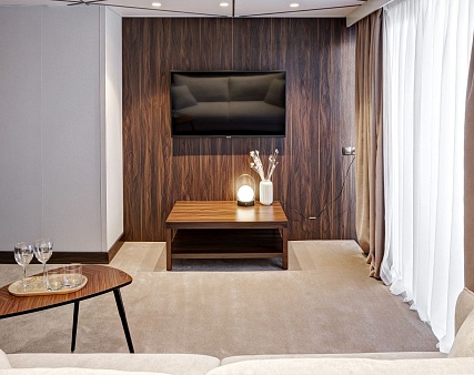 В каюте: двуспальная кровать (раздвигается), диван, панорамные окна, балкон, спутниковое ТВ, шкаф для одежды, холодильник, кондиционер, розетки 220V, телефон, радио, фен, капсульная кофемашина, электрочайник, cейф, душ, ванна, санузел. Площадь — 46 м2. (площадь балкона — 10 м2.)
