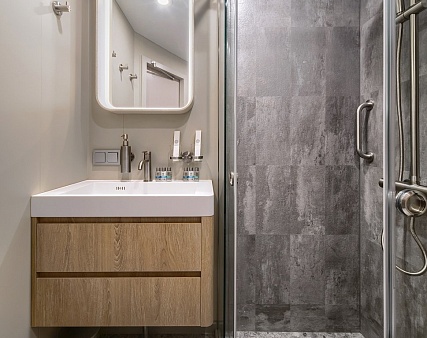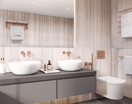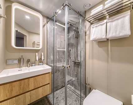 Основная идея интерьера наших кают — лаконичная роскошь во всем. Интерьеры выполнены в современном стиле с использованием премиальных материалов, обставлены эксклюзивной мебелью. Модная цветовая палитра гармонично сочетается с морем и безграничным небом, создавая умиротворяющую атмосферу. Эксклюзивный текстиль и удобные кровати в каютах помогут расслабиться и насладиться вашим путешествием в полной мере. Романтичные закаты и рассветы на собственной веранде подарят поистине незабываемые моменты.