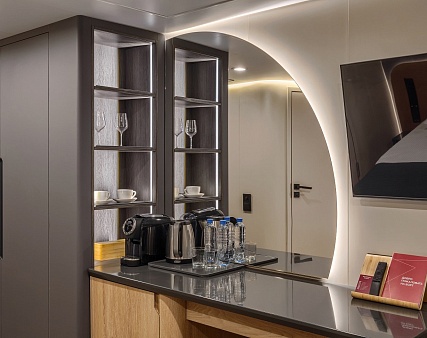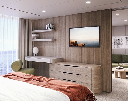 В каюте: двуспальная кровать, прикроватные тумбы, журнальный столик, письменный стол, гардероб диван, кресло, панорамные окна, телевизор, шкаф для одежды, холодильник, кондиционер, розетки 220V, телефон, радио, фен, капсульная кофемашина, электрочайник, cейф, душ, санузел. Площадь каюты 42,9 м2