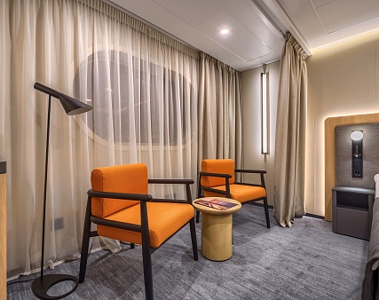 В каюте: двуспальная кровать (раздвигается), прикроватные тумбы, окно (не открывается), кресло, журнальный столик, письменный стол, шкаф для одежды, кондиционер, телевизор, холодильник, розетки 220V, телефон, радио, фен, капсульная кофемашина, электрочайник, сейф, душ, санузел. Площадь каюты 17,6 м2