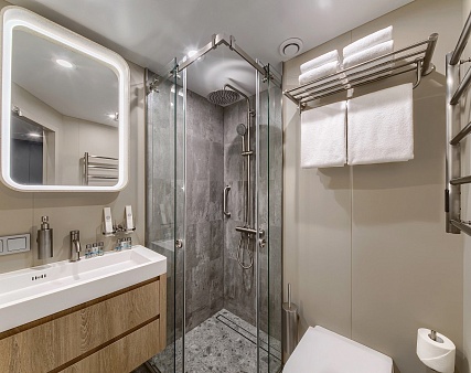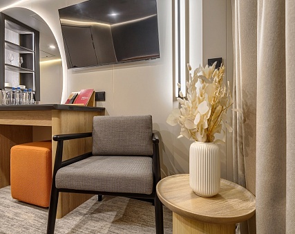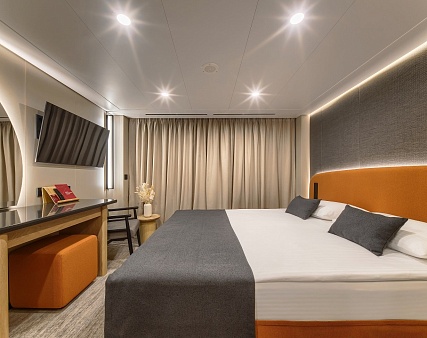 В каюте: двуспальная кровать (раздвигается), прикроватные тумбы, кресло, журнальный столик, письменный стол, шкаф для одежды, кондиционер, телевизор, холодильник, розетки 220V, телефон, радио, фен, капсульная кофемашина, электрочайник, сейф, душ, санузел. Площадь каюты 13,9 м2