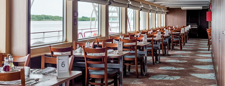 - Обед – заказная система питания (выбор блюд со 2-го дня круиза), фиксированная рассадка. Включённые напитки (без ограничения): вода, чай, кофе, морс.