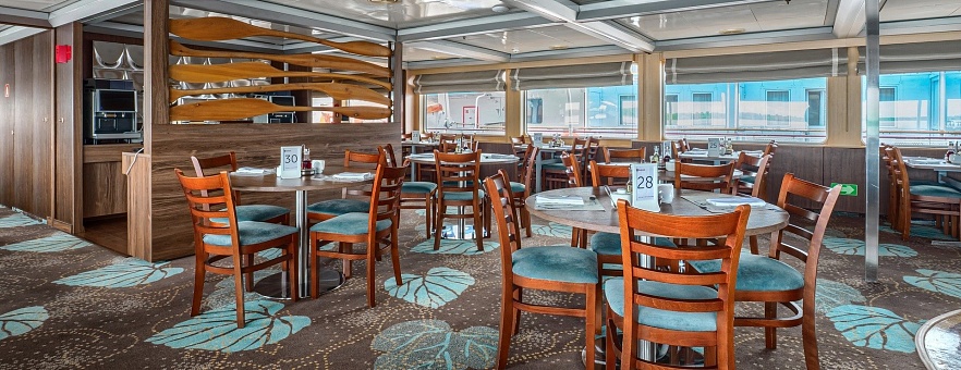 - Обед – заказная система питания (выбор блюд со 2-го дня круиза), фиксированная рассадка. Включённые напитки (без ограничения): вода, чай, кофе, морс.