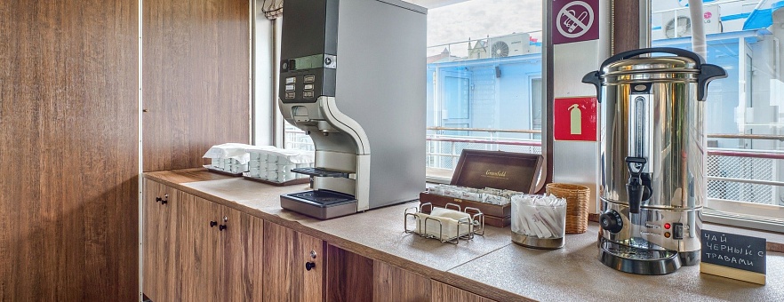 - Кофе-станция — общедоступный стол с горячими напитками. Время работы: с 6:00 до 00:00.