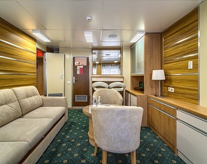 Просторная каюта с современным интерьером, мягкая мебель — диван, два кресла, двуспальная кровать, шкаф для одежды, телевизор c DVD, холодильник, радио, три обзорных окна, электророзетка на 220V, фен, кондиционер.