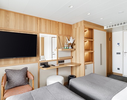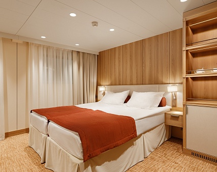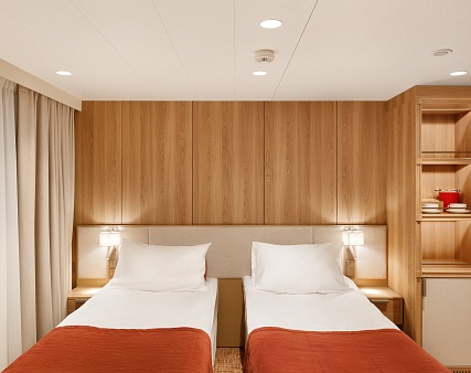 В каюте: две односпальные кровати (можно сдвинуть), прикроватные тумбы, туалетный столик, стул, шкаф, телевизор, холодильник, капсульная кофемашина (1 капсула в день на человека (по количеству гостей в каюте), чайник, радио, телефон, обзорное окно, душ, санузел, кондиционер, фен, сейф, халаты, электророзетка на 220V.
