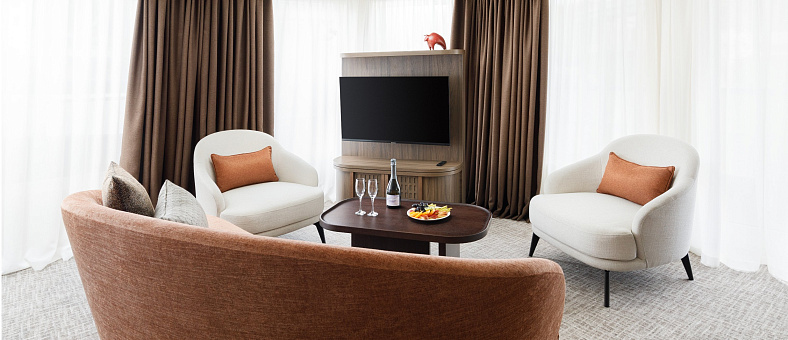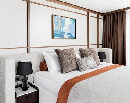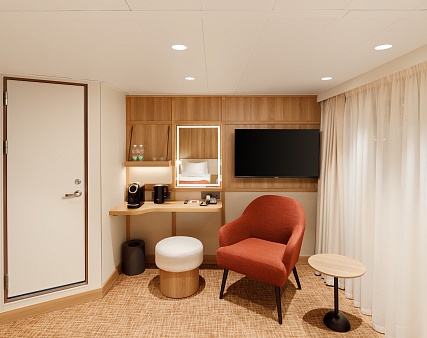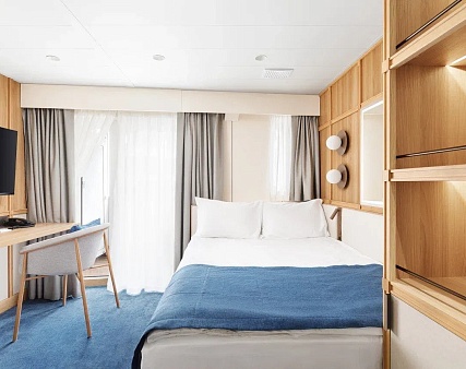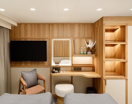 В каюте: терраса, двуспальная кровать, прикроватные тумбы, диван и два кресла, журнальный стол, туалетный столик, стул, шкаф, телевизор, холодильник, капсульная кофемашина (1 капсула в день на человека (по количеству гостей в каюте), чайник, радио, телефон, санузел с душем, кондиционер, фен, сейф, электророзетка на 220V.