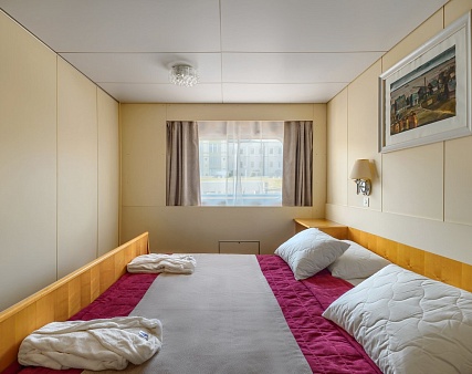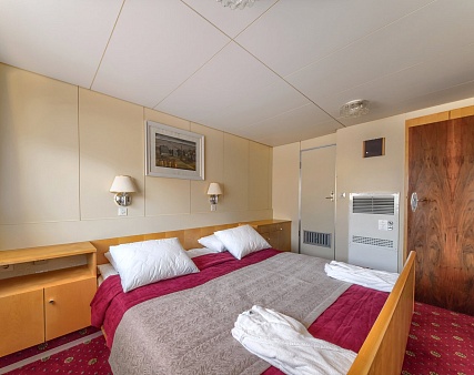 В каюте: два спальных места, шкаф для одежды, холодильник, фен, радио, душ, санузел, кондиционер, обзорное окно, электророзетка на 220V.