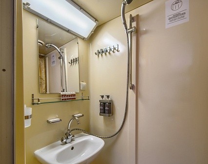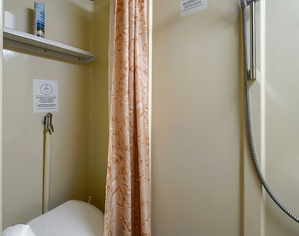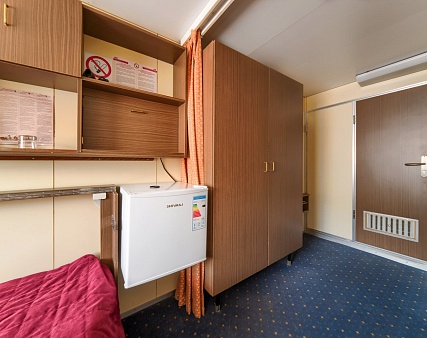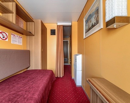 В каюте: одно спальное место, шкаф для одежды, холодильник, фен, радио, душ, санузел, кондиционер, обзорное окно, электророзетка на 220V.
