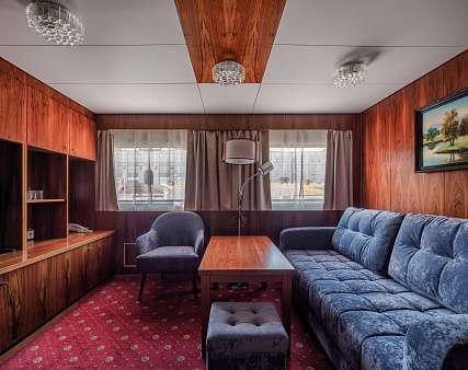 Вас ждут комфортабельные каюты, оснащённые санузлом с душевой, кондиционер, холодильник, а также телевизор и фен (в каютах класса «Люкс»). Помимо обширного каютного фонда, теплоход «Русь» предлагает большое количество уютных мест для отдыха. В атмосферных барах и гостеприимных ресторанах на теплоходе вас ждёт тёплый приём, расслабляющая обстановка и потрясающие панорамные виды.